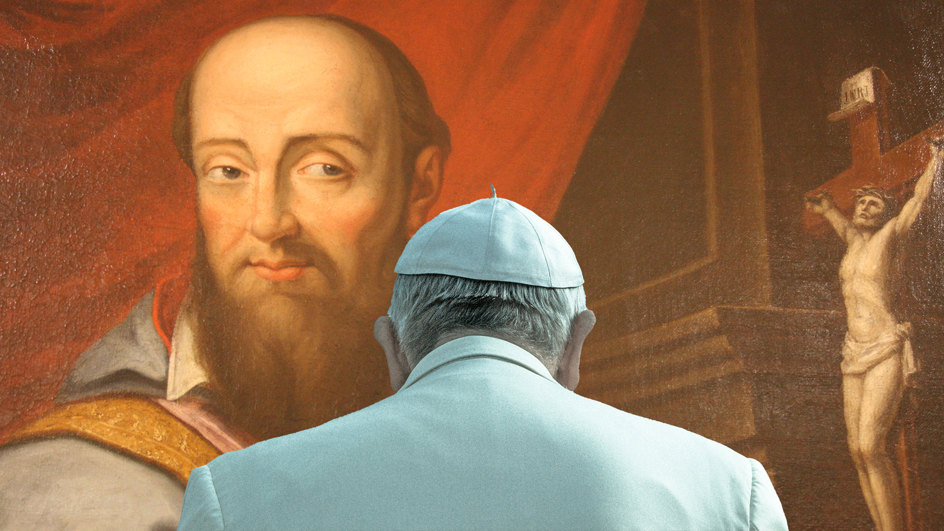 Papst Franziskus und Franz von Sales (Fotomontage von Herbert Winklehner unter Verwendung eines Fotos von Coronel Gonorrea/unsplash und eines Gemäldes aus dem Diözesanhaus „La Puya“ in Annecy, Frankreich)
