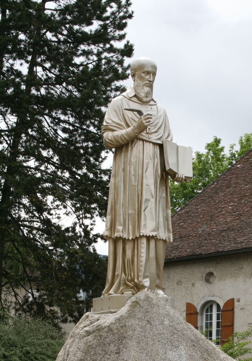 Statue vor der Pfarrkirche in Thorens, Frankreich. Aufgestellt zur Erinnerung an das 400. Jährige Jubiläum seiner Bischofsweihe (8.12.1602-8.12.2002)