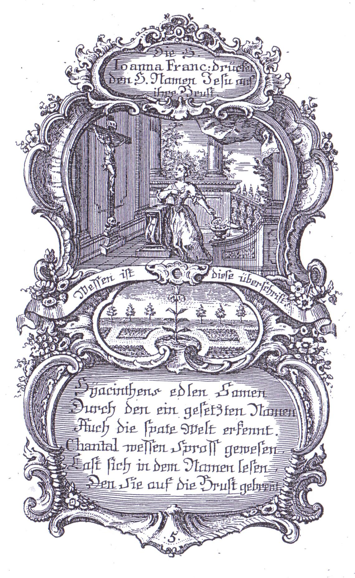 Johanna Franziska drückt den Namen Jesu auf ihre Brust. Stich von Franz Xaver Jungwirth (1720-1790)