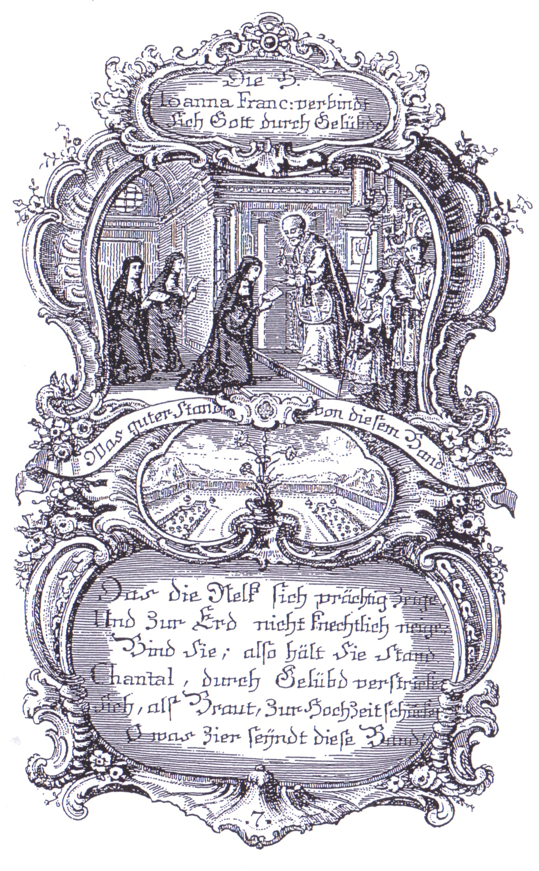 Johanna Franziska verbindet sich mit Gott durch Gelübde. Stich von Franz Xaver Jungwirth (1720-1790)