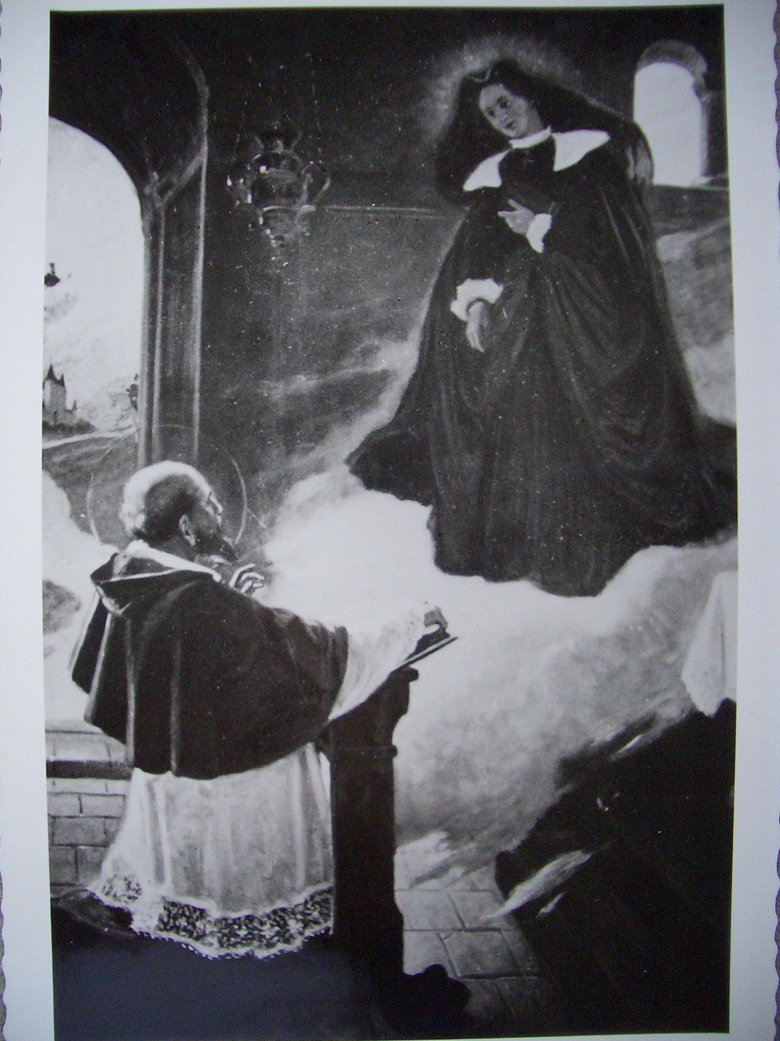 Franz von Sales sieht in einer Vision Johanna Franziska im Witwenkleid. Gemälde von Altheimer, gemalt im ehemaligen Heimsuchungskloster Chotieschau, Tschechien. Heute befinden sich die Originale in Aleppey, Kerala, Indien: Congregation of the Visitation of Alleppey (S.V.C.).