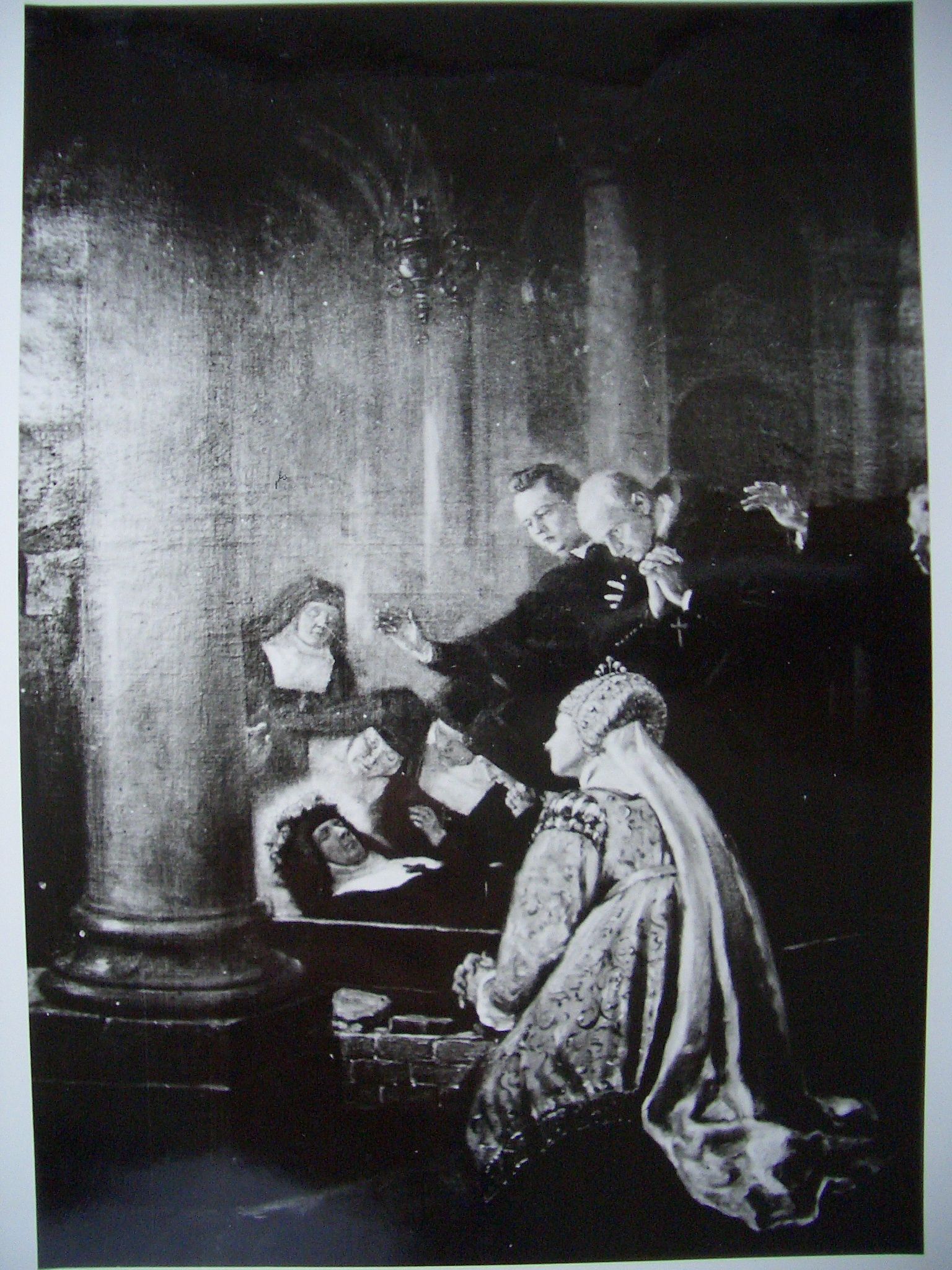 Johanna Franziska wird im Heimsuchungskloster von Moulins in den Sarg gelegt und nach Annecy überführt - Rechts: die Herzogin von Montmorency, die Nichte von Papst Sixtus V., eine Freundin Johannes, die nach dem Tod ihres Ehemannes ebenfalls Heimsuchungsschwester wird. Gemälde von Altheimer, gemalt im ehemaligen Heimsuchungskloster Chotieschau, Tschechien. Heute befinden sich die Originale in Aleppey, Kerala, Indien: Congregation of the Visitation of Alleppey (S.V.C.).