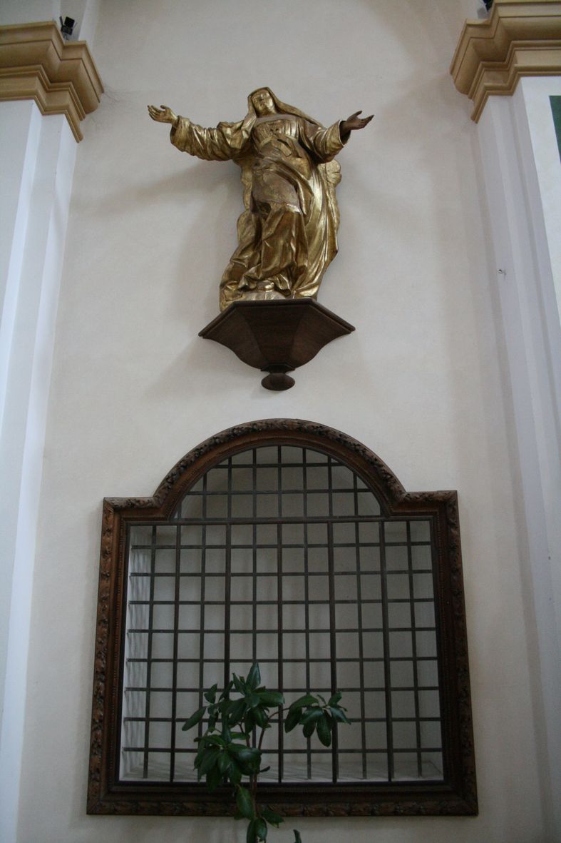 Statue in der Franz von Sales Kirche in Annecy, Frankreich - Unten das Originalchorgitter des zweiten Heimsuchungsklosters von Annecy