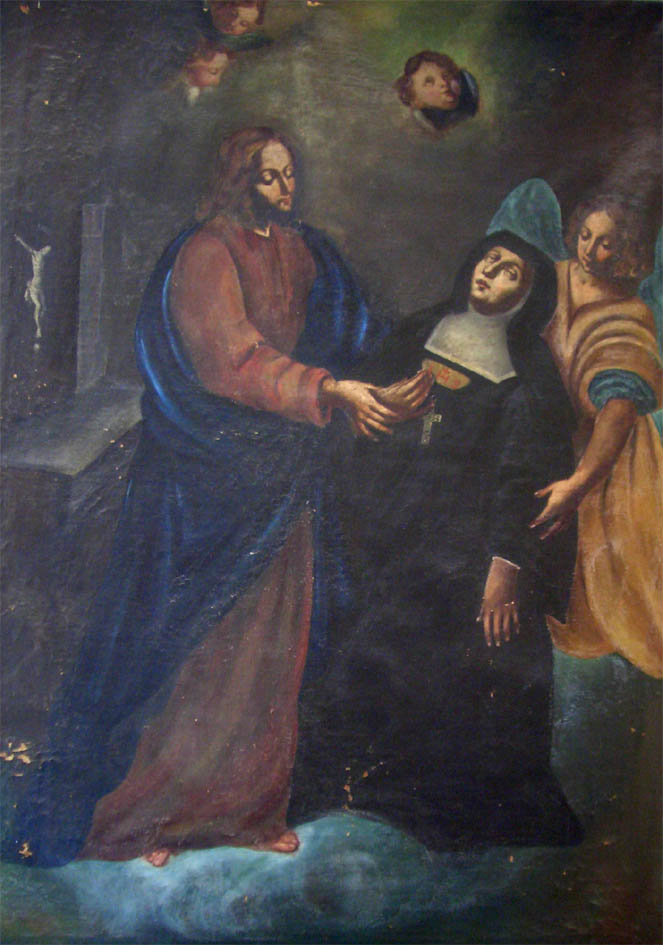 Johanna Franziska schreibt sich den Namen Jesu auf die Brust. Gemälde im Heimsuchungskloster von San Remo, Italien
