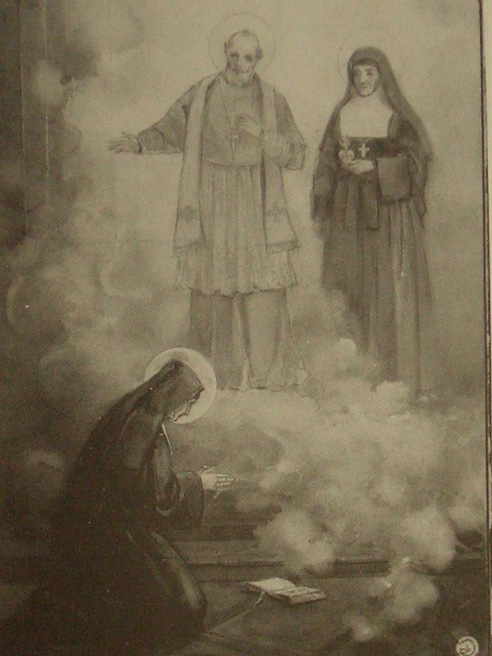 Margareta Maria Alacoque lernt als Heimsuchungsschwester die beiden heiligen Stifter der Heimsuchung Franz von Sales und Johanna Franziska von Chantal kennen, Gemälde aus dem Heimsuchungskloster Paray-le-Monial, Frankreich